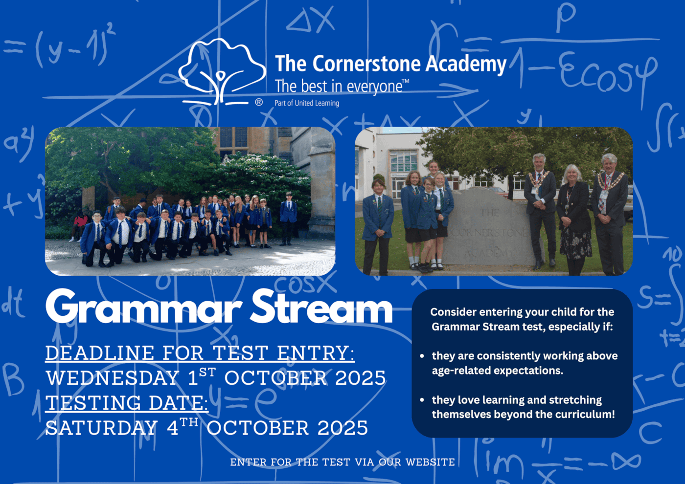 We are not a selective school. However, students who apply to The Cornerstone Academy are invited to sit an eligibility test to join our Grammar Stream, particularly if they work consistently to a standard above age-related expectations, and enjoy stretching themselves academically. There are currently 30 places available for Grammar Stream admission.