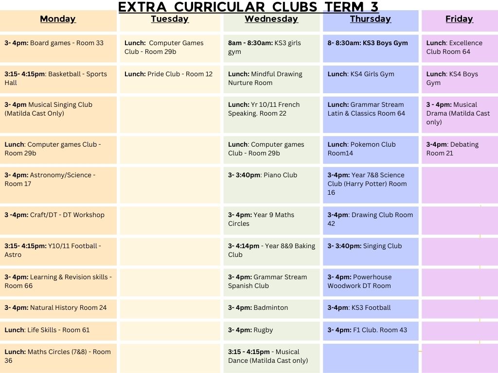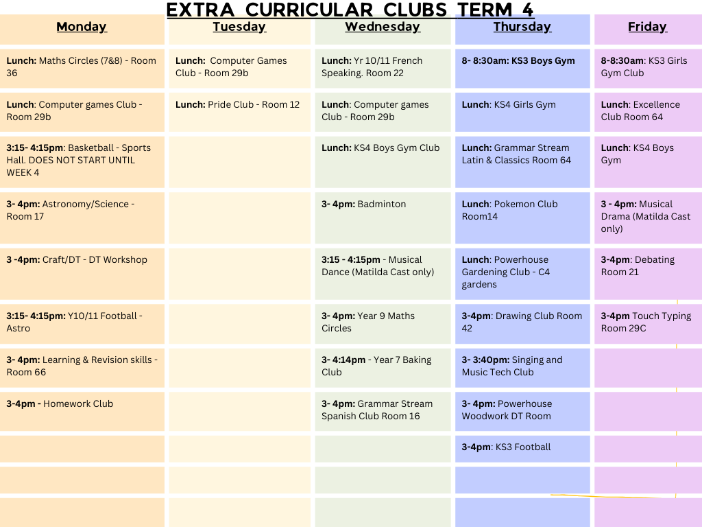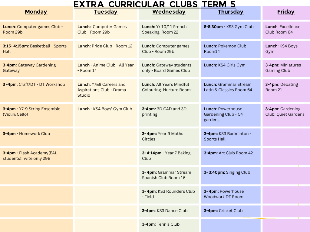 At lunchtime, sports clubs students must have trainers. For afterschool, sports clubs students should have their Cornerstone Academy PE kit. For sports clubs, all jewellery must be removed and hair must be tied back. For other clubs, normal school uniform is to be worn, unless specified by the staff at the club.